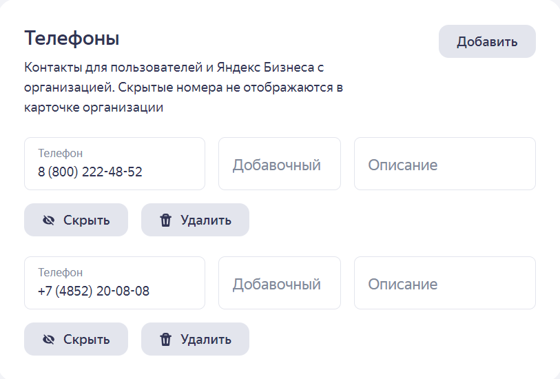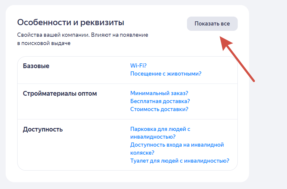 Советуем заполнить все, что просит Яндекс (или выведать у клиента, если вы подрядчик). Информация отобразится в профиле компании на Картах и в поиске.