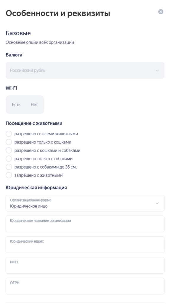 Далее количество и содержание полей будет зависеть от сферы бизнеса. Например, SPA-салон может указать, какие косметические услуги и программы доступны, а производственное предприятие — из каких материалов производятся изделия.
