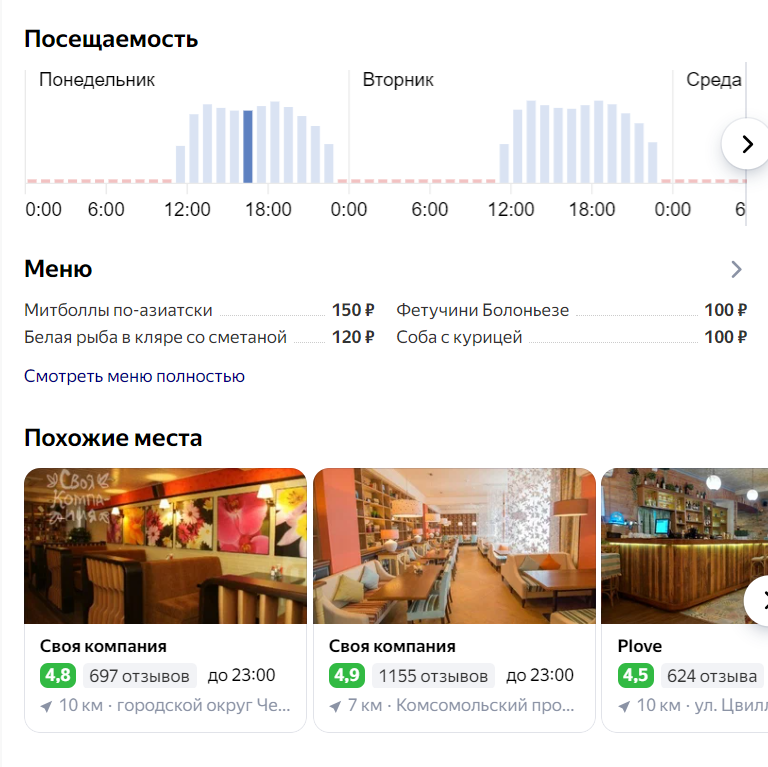 Карусель «Похожие места» — последний блок в карточке организации. В ней показываются компании, близкие по геолокации и виду деятельности. С одной стороны, не хочется видеть конкурентов в своем профиле, с другой — у вас есть возможность попасть в аналогичный блок. Работайте с отзывами, загружайте привлекательные фотографии и получайте переходы из карточек конкурентов.