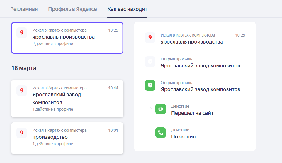 В разделе «Как вас находят» можно узнать, из каких сервисов Яндекса и по каким запросам пользователи попадают на вашу карточку (учитываются последние 50 обработанных визитов). Чтобы увидеть подробную информацию о действиях пользователя, нажмите на нужный блок.