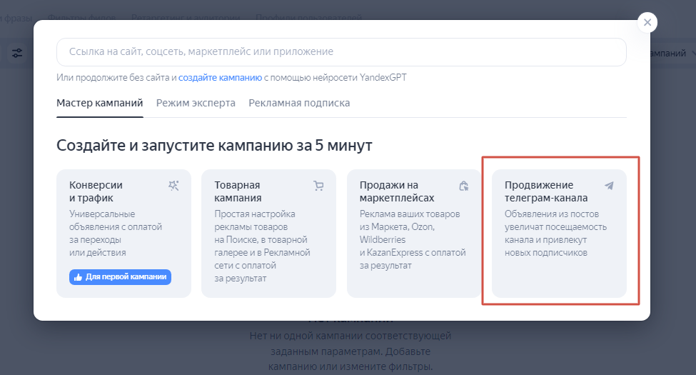 В личном кабинете кликните «Добавить кампанию», выберите «Мастер кампаний» и «Продвижение телеграм-канала».