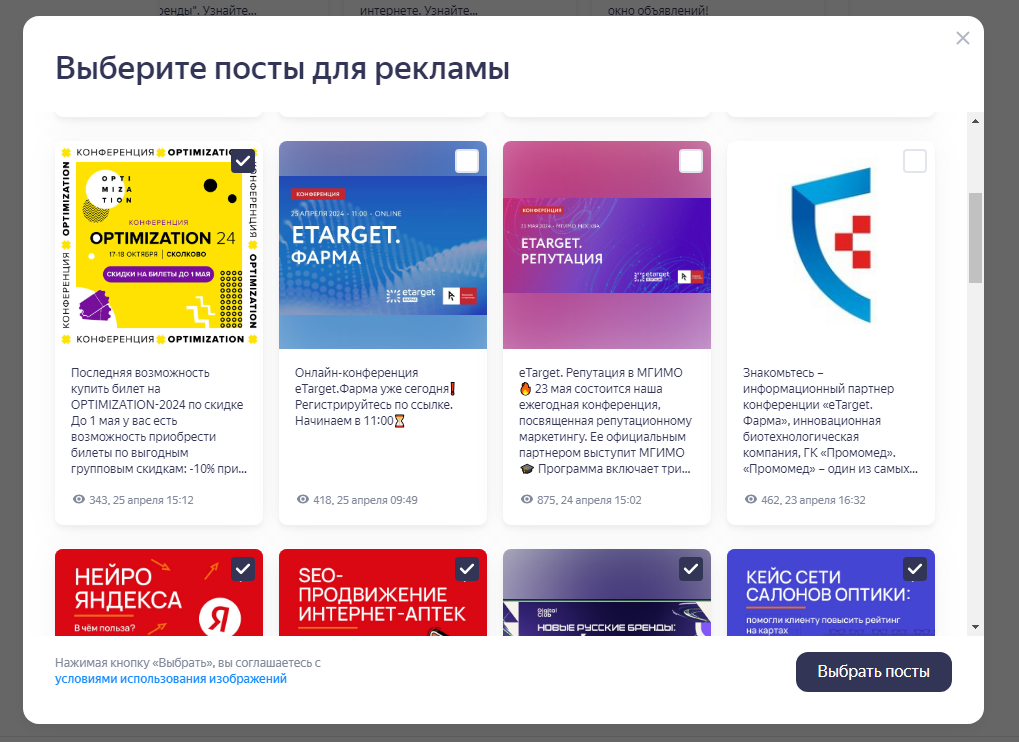 Те посты, которые не нужно рекламировать, исключите, нажав три точки справа. Через это же меню можно отредактировать рекламу— изменить картинку, текст, заголовок.
