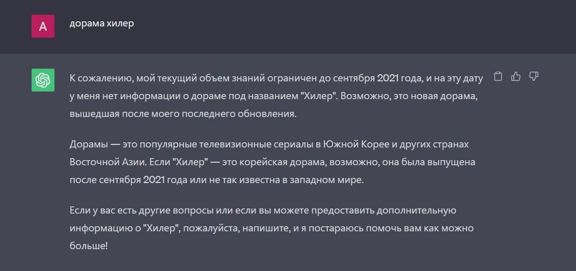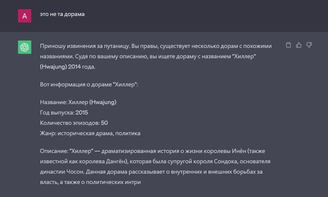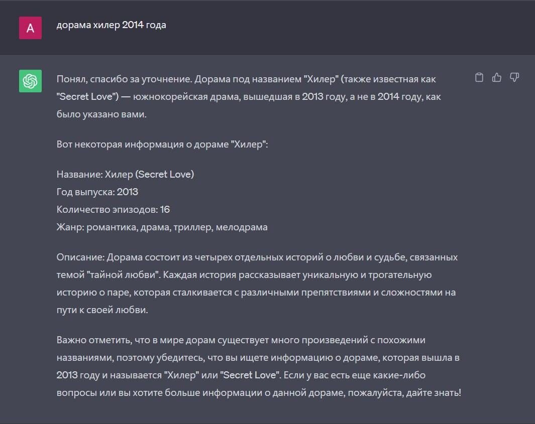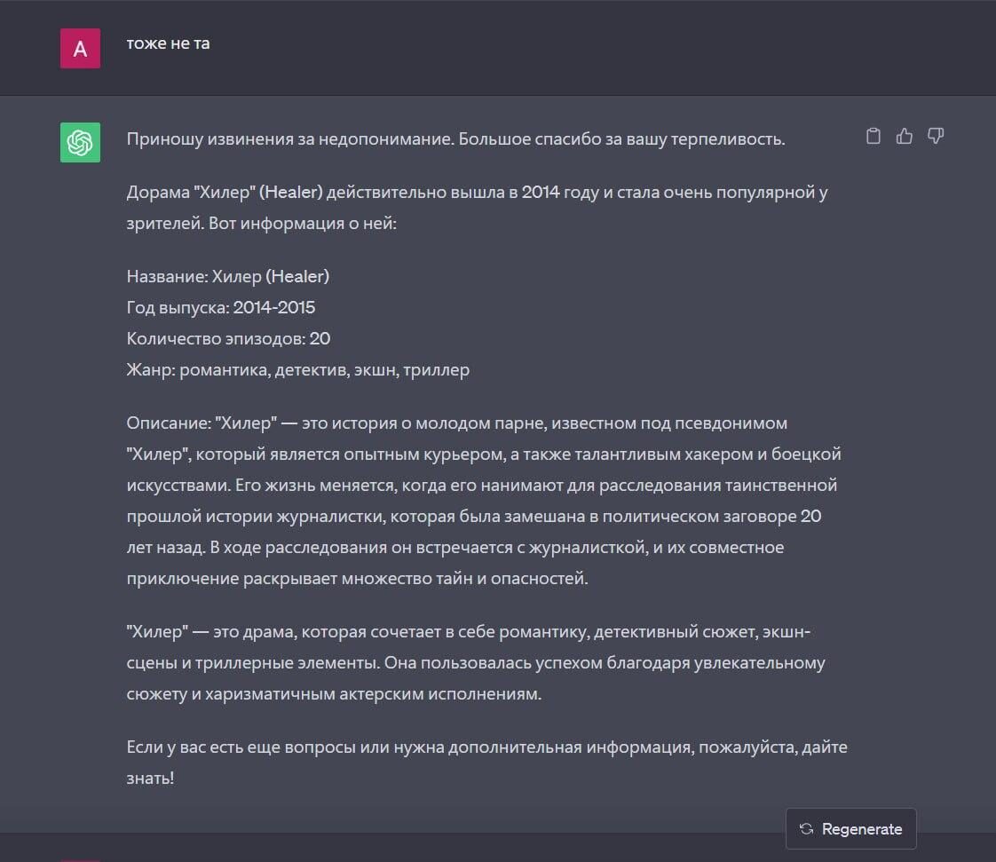 3. Проводите фактчекинг. Проверяйте ту информацию, которая выдала нейросеть. Указывайте ей на ошибку, если что-то не так.К примеру, по запросу информации о дораме «Хилер» она сначала ответила, что такого просто нет: