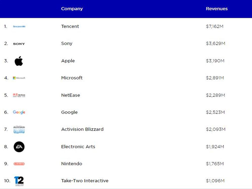 Во втором квартале 2023 года в рейтинге крупнейших мировых гейминг-компаний по выручке лидировали: китайская Tencent ($7 млрд), японская Sony ($3,7 млрд), американская Apple ($3,1 млрд), американская Microsoft ($2,9 млрд) и китайская NetEase ($2,3 млрд).