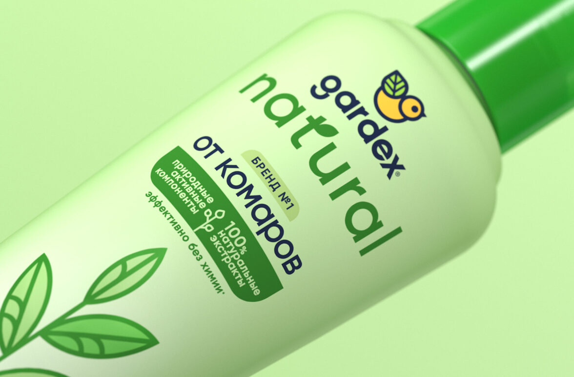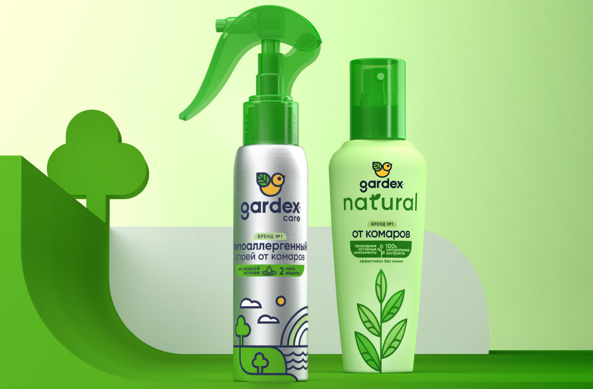 Компактный блок в центре концентрирует всю главную информацию о продукте, здесь все структурировано и понятно потребителю. Плоский стиль во всем: в иллюстрации, в клеймах, в лого. Экстремальная линейка сохранила ключевой элемент — щит, символ надежной защиты. Для GARDEX NATURAL в этом же стиле была изображена веточка.