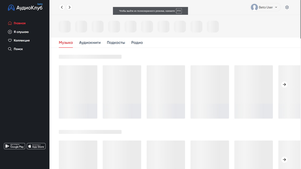 Слева на главной странице сервиса расположено меню навигации, откуда можно осуществить быстрый переход на домашнюю страницу, в историю прослушивания, в раздел с избранным контентом и в поиск. На основной странице платформы также есть основные разделы сервиса: «Музыка», «Аудиокниги», «Подкасты» и «Радио», подборка «Выбор редакции», вход в личный кабинет слушателя и треки, подобранные рекомендательными алгоритмами «АудиоКлуба».