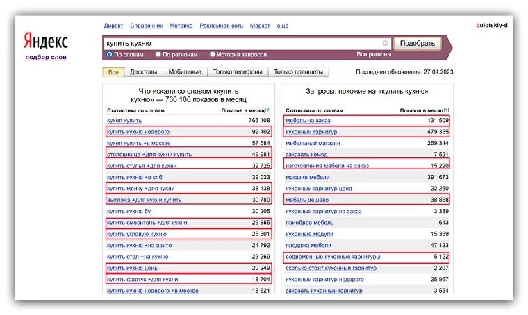 Скриншот из Яндекс Вордстат: красным выделили запросы, которые магазин мебели мог бы превратить в темы публикаций. И это только про кухни!