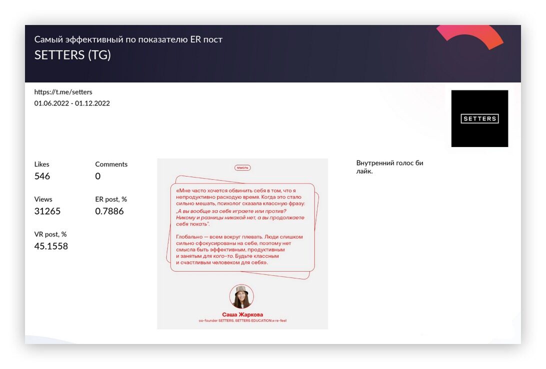 Пример из отчёта Popsters: на сайте сервиса можно фильтровать публикации по разным показателям, а в PDF приложение поместит самый эффективный пост по ER