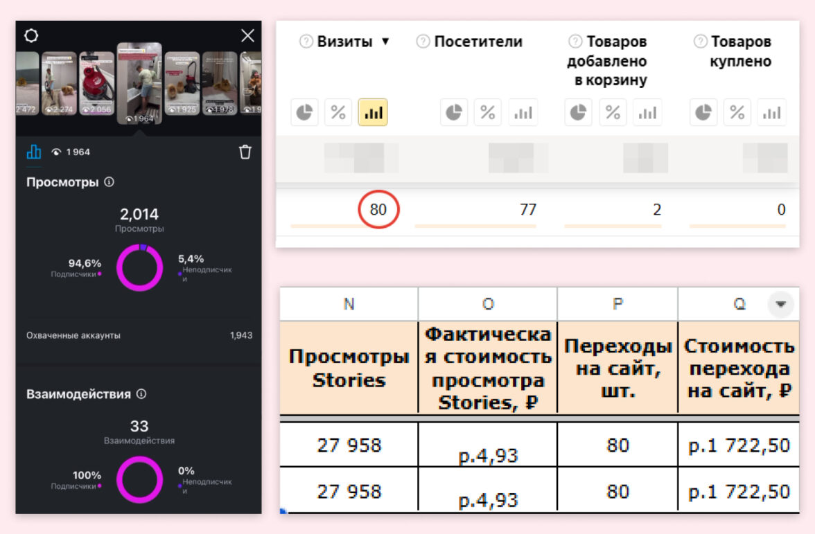 Можно смотреть количество переходов по ссылке с истории в аналитике Инстаграма* (изображение 1). Но цифры там не всегда достоверны: статистика показывает всех пользователей, нажавших на ссылку, но не тех, кто действительно переходит на сайт. Поэтому достовернее смотреть количество переходов в Яндекс Метрике в отчете по UTM-меткам (изображение 2). Затем вносим эти цифры в таблицу и считаем стоимость просмотра истории и перехода на сайт (изображение 3)