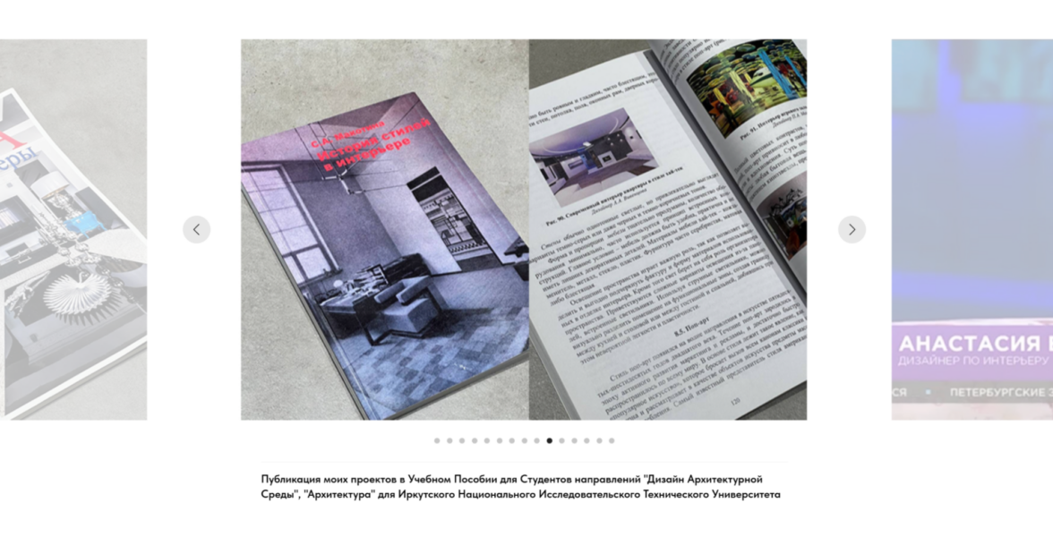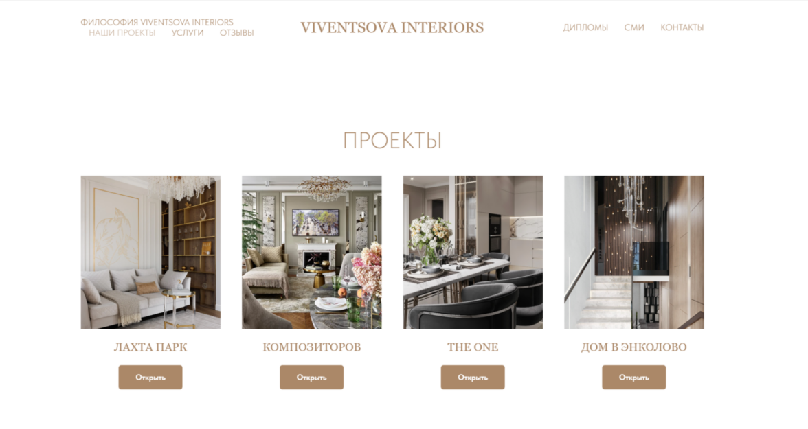 Например, Анастасия Вивенцова — профессиональный дизайнер из Санкт-Петербурга, ведет собственный многостраничный сайт, выполненный в духе минимализма. Белый фон, бежевые кнопки и шрифт, акцент — на роскошных кейсах. На отдельных страницах Анастасия демонстрирует наградные дипломы, материалы из СМИ: публикации проектов в профильных журналах, выступление в передачах, новостях, прямом эфире.