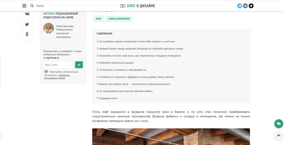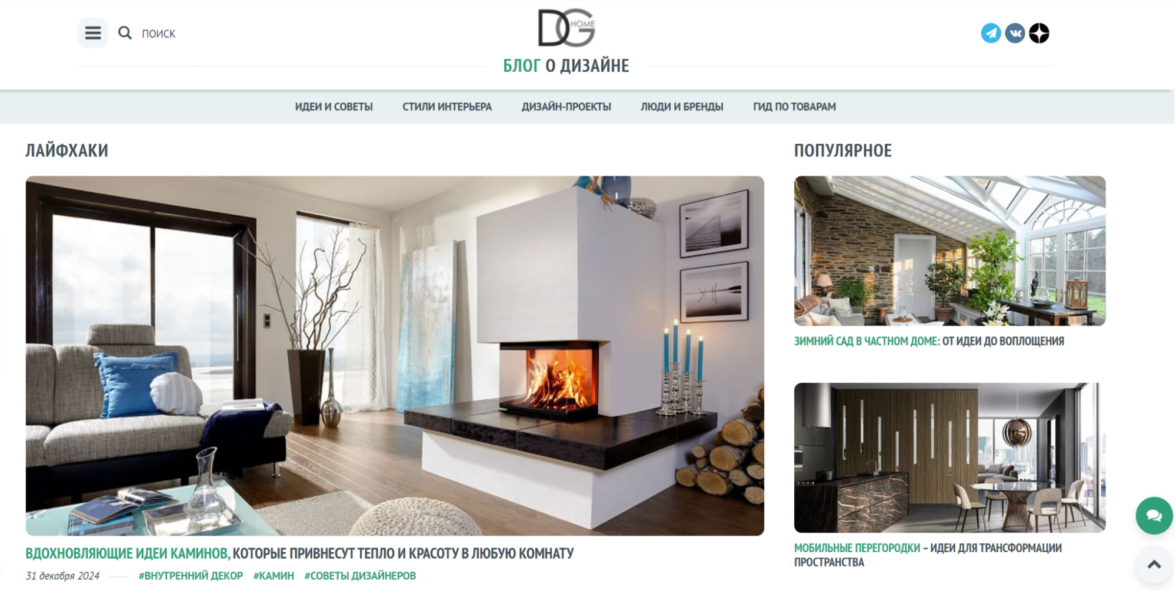 DG HOME — пример экспертного сайта с полезными идеями и советами, готовыми проектами, выполненных в разных стилях. Поиск конкретной публикации упрощают тематические теги. Для выпуска собственного контента нужно подать заявку на вступление в редакционный отдел.