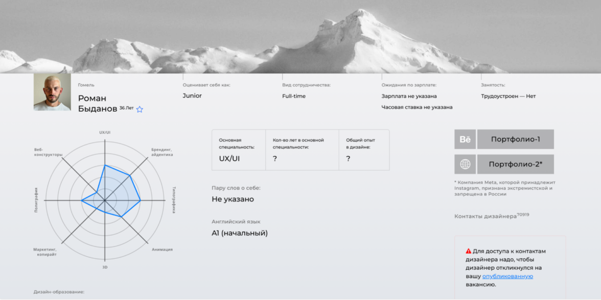 При заполнении портфолио указывают основной профиль, навыки, уровень — начальный, средний или профи. Можно написать о себе небольшой рассказ, предпочитаемый формат работы и уровень зарплаты. На удобной сетке-паутинке сервис распределяет указанные скиллы и уровень владения каждым. Можно прикрепить ссылки на портфолио.