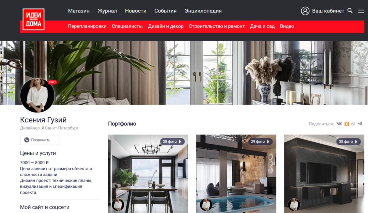 Houzz. На этом сервисе можно публиковать кейсы напрямую через альбомы. При заполнении аккаунта указывается категория работы, география деятельности, небольшое описание об опыте специалиста.