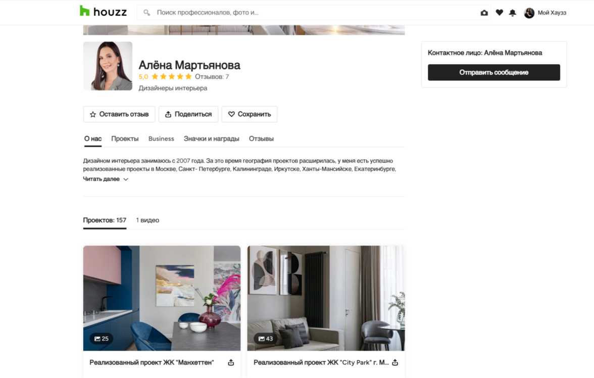 На сайте можно получать значки и награды от Houzz, а те, кто уже сотрудничал с дизайнером, оставляют отзывы. Под описательной частью размещаются альбомы с проектами. Связь с заказчиком поддерживается при помощи сообщений на сайте.