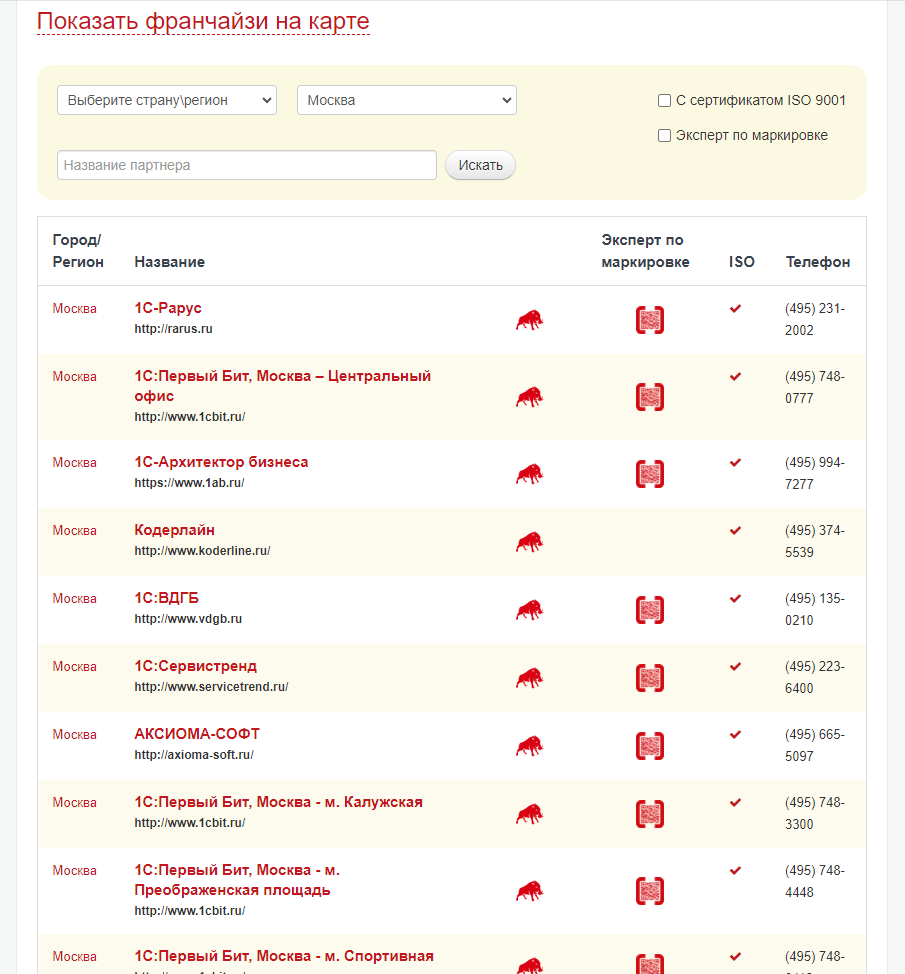 Выбрать ближайшего партнера 1С можно на сайте с отбором по региону и городу.