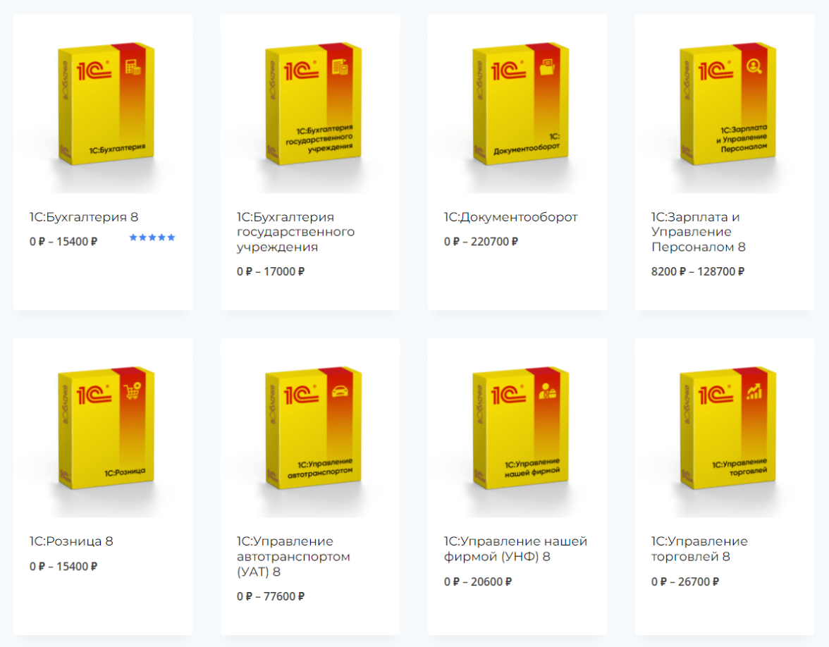 Начнем с самого, как может показаться надежного и безопасного варианта — покупки программы 1С у разработчика программы. На сайте вы найдете полный перечень программного обеспечения от компании 1С и сможете выбрать то, что подходит именно для ваших нужд.