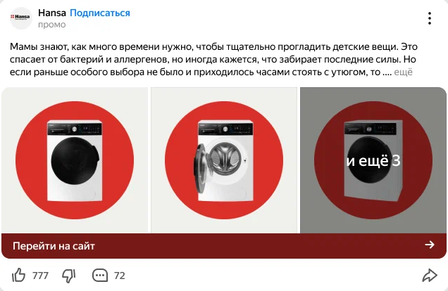 Помимо этого, совсем недавно в Дзене появились реклама промопостов. Она напоминает пост из ленты запрещенной соцсети: текст, картинка и кнопка призыва к действию. Данный формат показывается не только в ленте Дзена, но теперь также и на сайтах партнеров рекламной сети Яндекса (РСЯ).