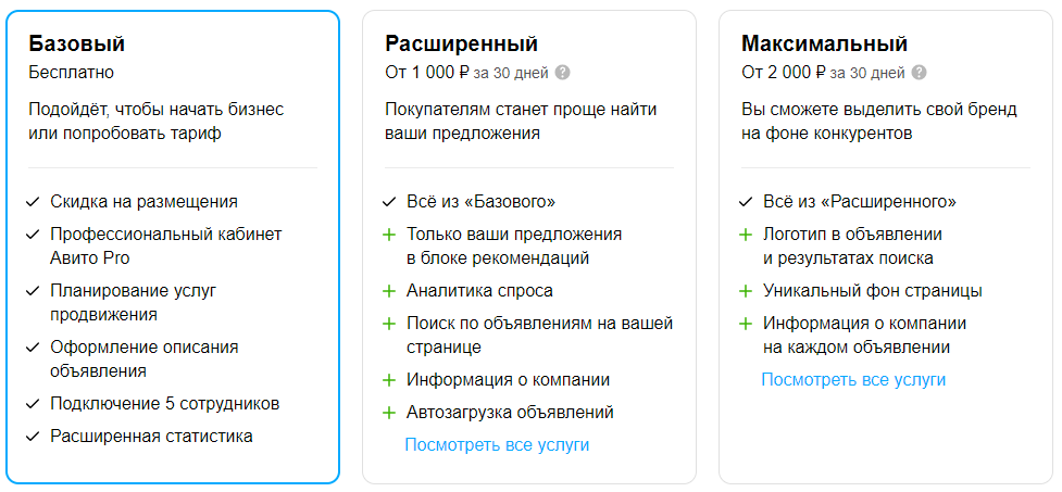 Канал №4. Реклама на Авито. Авито очень популярная площадка в России, но бизнес ей редко пользуется. Например, для тех, кто продает свои товары или услуги, это вполне актуально. Для продвижения есть три базовых пакета, которые содержат разные опции: коллтрекинг, скрытие конкурентов в рекомендациях, оформление страницы компании, а также брендирование и не только.