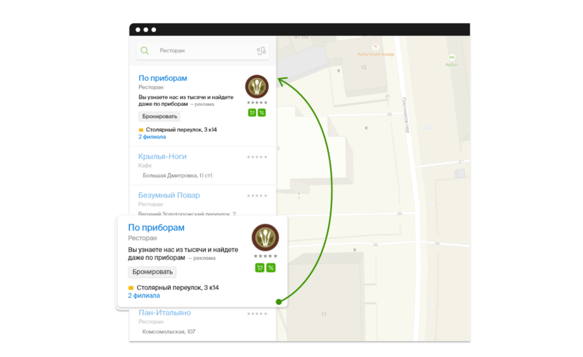 Гостинично-ресторанный бизнес. С помощью рекламы на сервисах онлайн-карт компании могут привлечь внимание аудитории к заведениям. Если разместить объявление об акциях, скидках и предложениях на платформе, пользователи изучат окрестности и построят план поездки, не выходя из приложения. Это позволит повысить конверсию.