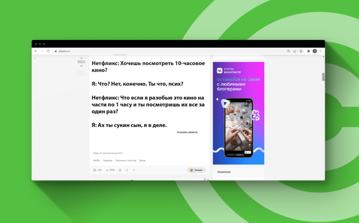 Pikabu — информационно-развлекательное сообщество, где более 3 миллионов пользователей размещают истории из жизни, шутки и мемы. Платформу посещают 45 млн человек в месяц. Самая активная аудитория — люди 19–34 лет.