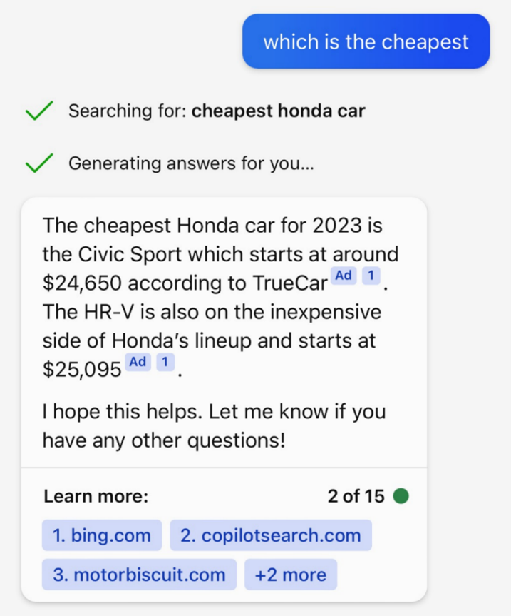 Рекламные форматы развиваются и становятся все более изощренными. Например, когда пользователь делает запрос, бот вроде бы выдает ссылку, однако, если навести на нее курсор, Bing Chat может сначала показать рекламу, и только потом легитимную ссылку для загрузки утилиты.
