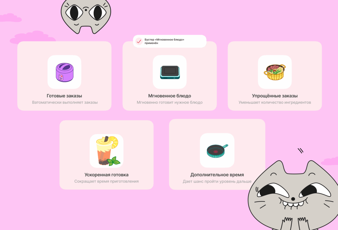 Игровая механика была напрямую связана с покупками в Самокате. Для продвижения по игре пользователям помимо приготовления блюд нужно было выполнять разнообразные продуктовые задания — оформлять заказы в целевых категориях или на определённый чек.