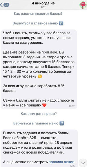 Это хорошее дополнение к любой основной механике, которую вы используете в чат-боте. Если пользователи видят свой и общий рейтинги игроков, у них просыпается азарт и желание соревноваться. Это помогает получить повторные касания и более глубокое и длительное вовлечение аудитории.