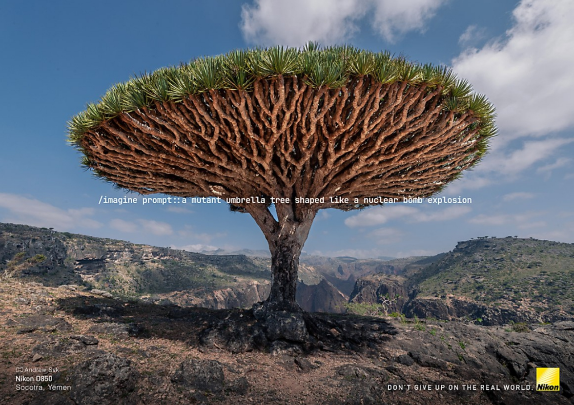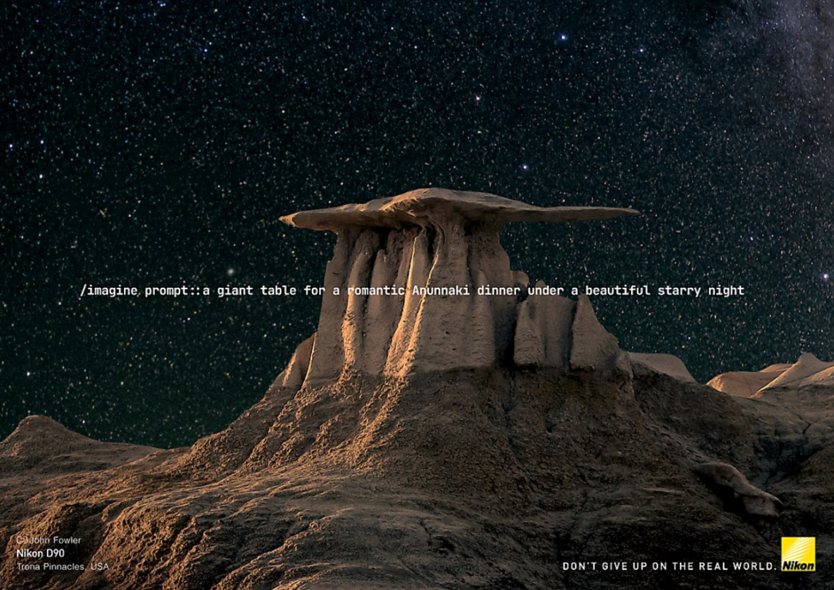 Посмотрите картинки выше. На первый взгляд можно предположить, что они сгенерированы нейросетью. Но в действительности это фотографии, сделанные на Nikon. Это билборды туристической компании, на которых написан промпт для нейронки, генерирующей картинки. И эти промпты соответствуют тому, что изображено на заднем фоне. Но при этом никакая нейронка, конечно же, не использовалась. Глобальная идея здесь заключается в том, что Земля полна удивительных артефактов и вы можете запечатлеть это на фотоаппарат, увидеть своими глазами, прочувствовать этот опыт.