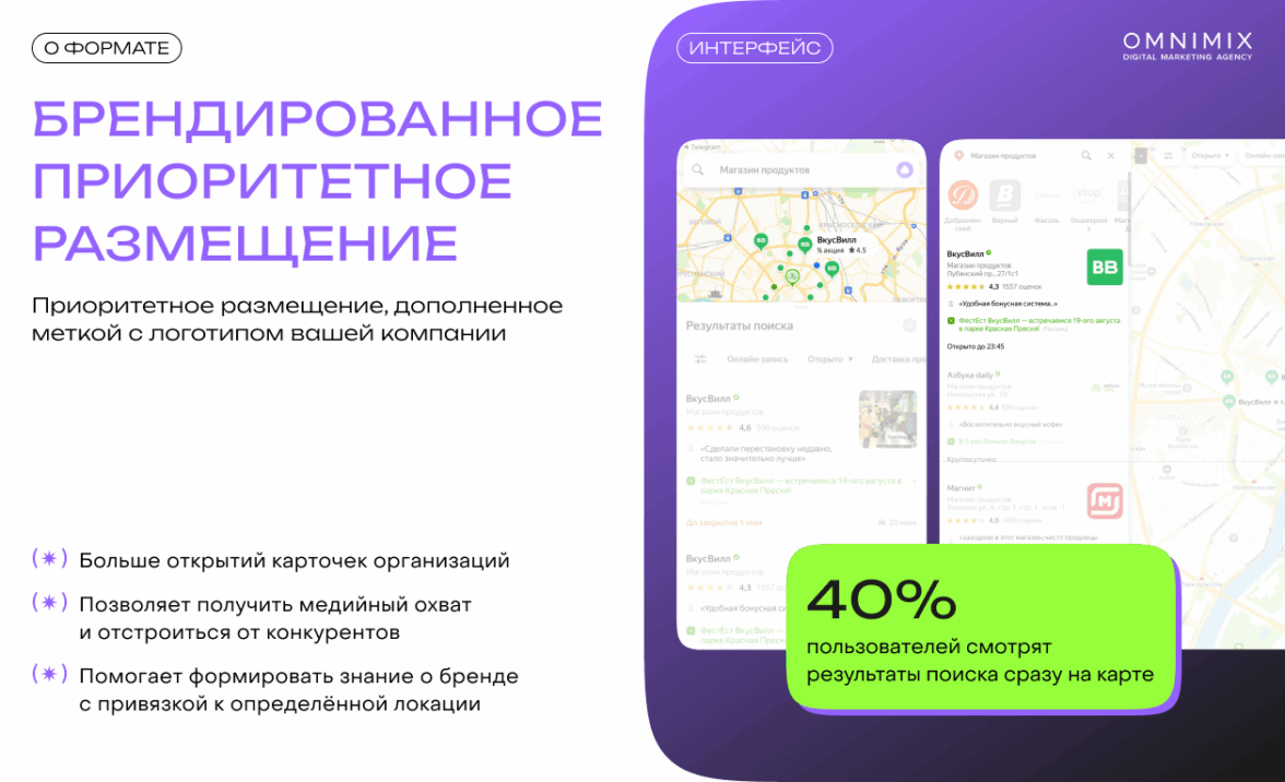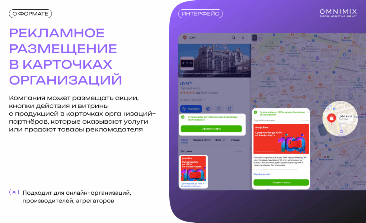 От узнаваемости (премиум-форматы, брендирование) до конверсии (пины, приоритетное размещение, рекомендации маршрутов). Это полноценный канал для решения любых маркетинговых задач.