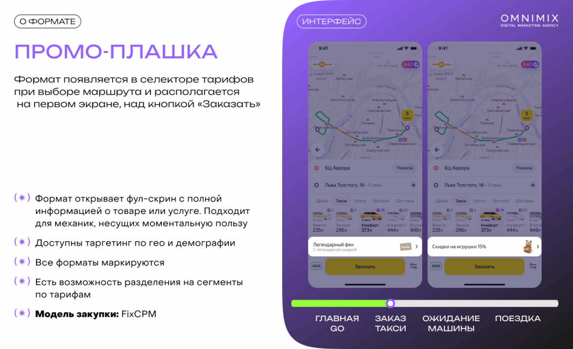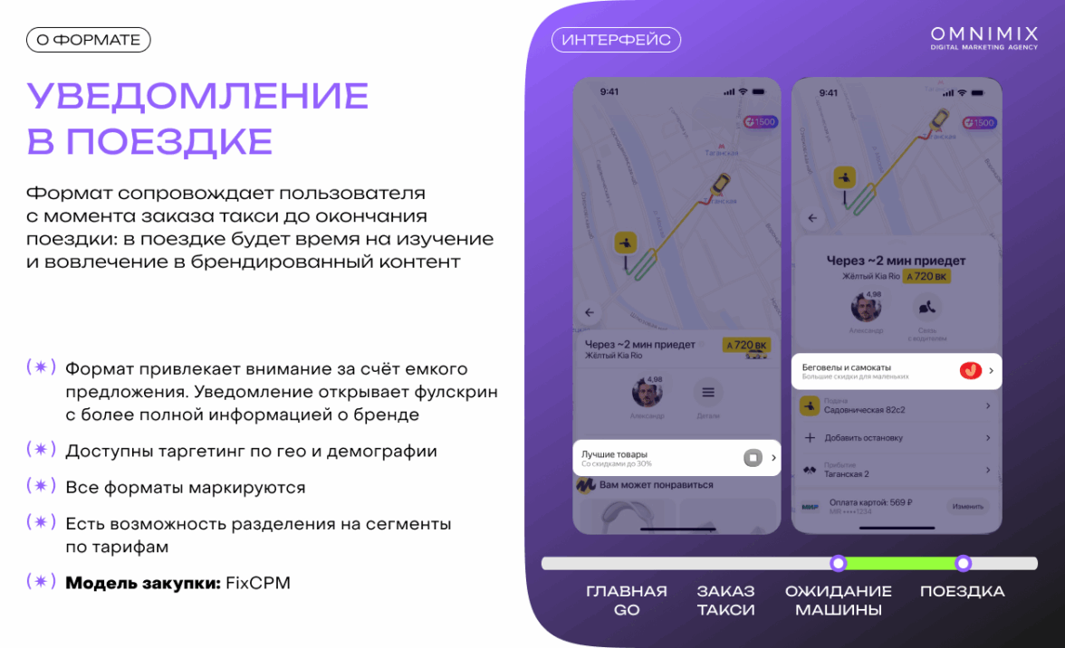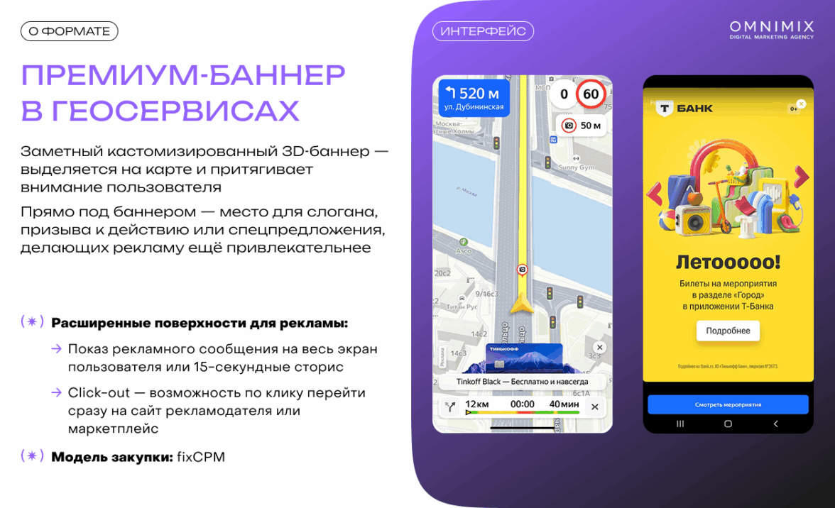 • Геоконтекст и поведенческие данные. Рекламное сообщение встраивается в путь пользователя — будь то карта, маршрут или корзина заказа. Это позволяет достигать максимальной релевантности.