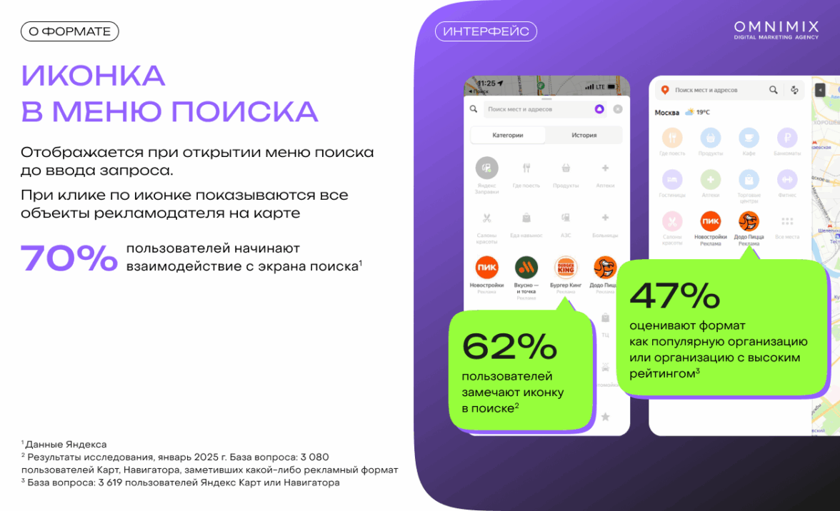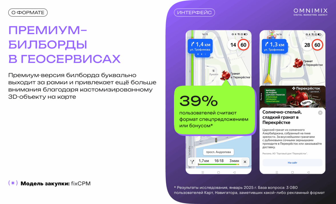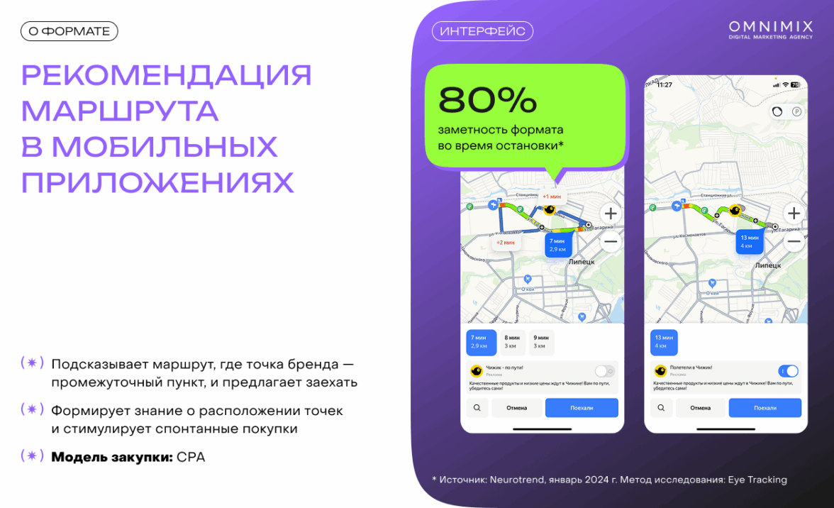 • Нативность восприятия. Реклама воспринимается не как баннер, а как элемент интерфейса — метка на карте, подсказка по маршруту или акция в выдаче. Это снижает баннерную слепоту и повышает вовлечённость.