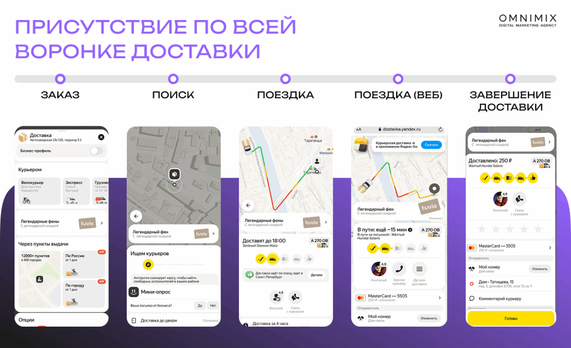 • Массовая аудитория и высокий охват. Яндекс.Карты и Навигатор используют десятки миллионов активных пользователей ежемесячно. Яндекс Go с функцией «Доставка» — 47 млн MAU, Яндекс.Еда — 20 млн MAU. Это крупнейшие точки контакта в повседневной жизни.
