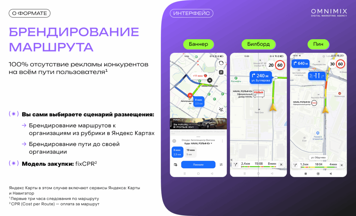 База (карточки + приоритетное размещение) + вовлекающие форматы (пины, баннеры) + имидж (брендированные маршруты, премиум-форматы). Такой микс даёт максимальный эффект: от перформанса до брендинга.