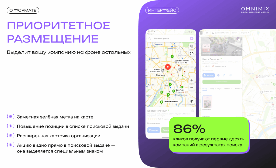 Это недорогой способ выделиться и сразу получать больше звонков, маршрутов и визитов. Приоритетное размещение — фундамент любой кампании в геосервисах.