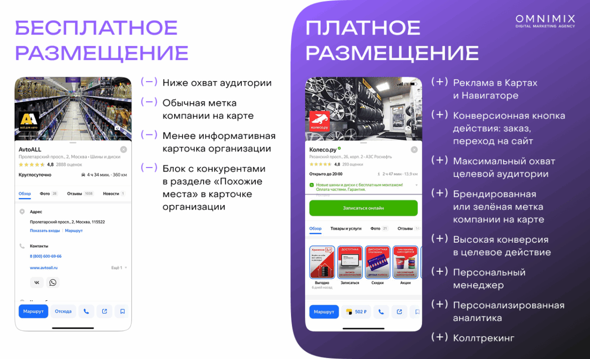 Инсайт: по данным практики OMNIMIX, геосервисы показывают особенно высокую эффективность для бизнесов с физическими точками продаж и локальным спросом. Пользователь, который ищет кафе «рядом со мной», находится в шаге от конверсии — и задача рекламы в этот момент не убедить, а подсказать правильный выбор.