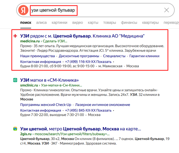 Также вы подбираете ключевое слово в зависимости от ниши. Если на условной Мясницкой находится салон красоты или медицинский центр — пользователь может забивать в поиск слова «врач, «салон», «клиника», «процедура», все виды услуг — «узи», «лифтинг», «консультация», «лечение кариеса»…
