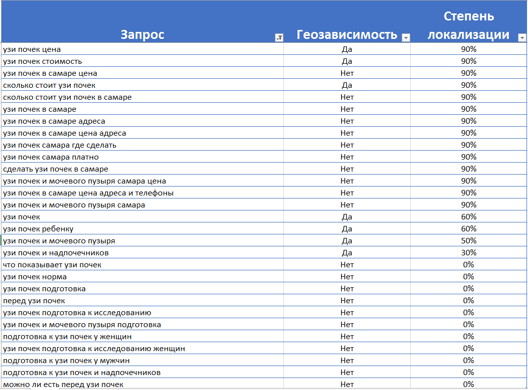 Точное значение параметра подбирается индивидуально опытным путем в соответствии с тематикой и особенностями сайта. Обычно, мы используем запросы со степенью локализации от 30%. Но если запросов очень много — планку повышаем до 50, 60% и более. Это актуально, например, для медицинской тематики.