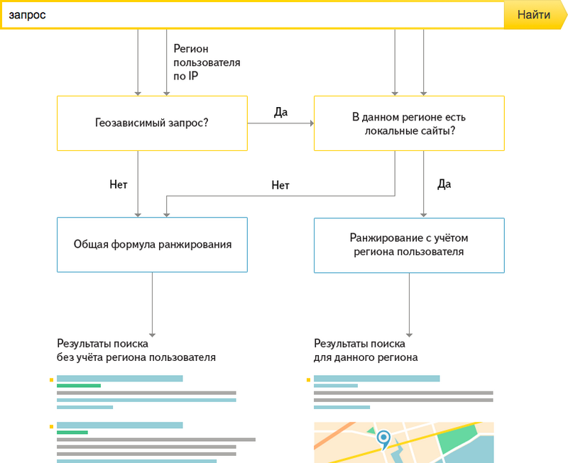 Геозависимость — бинарный показатель. То есть он может принимать только два значения: «да» и «нет». Алгоритм работы поисковика по формированию выдачи с учётом геозависимости наглядно показывает эта схема: