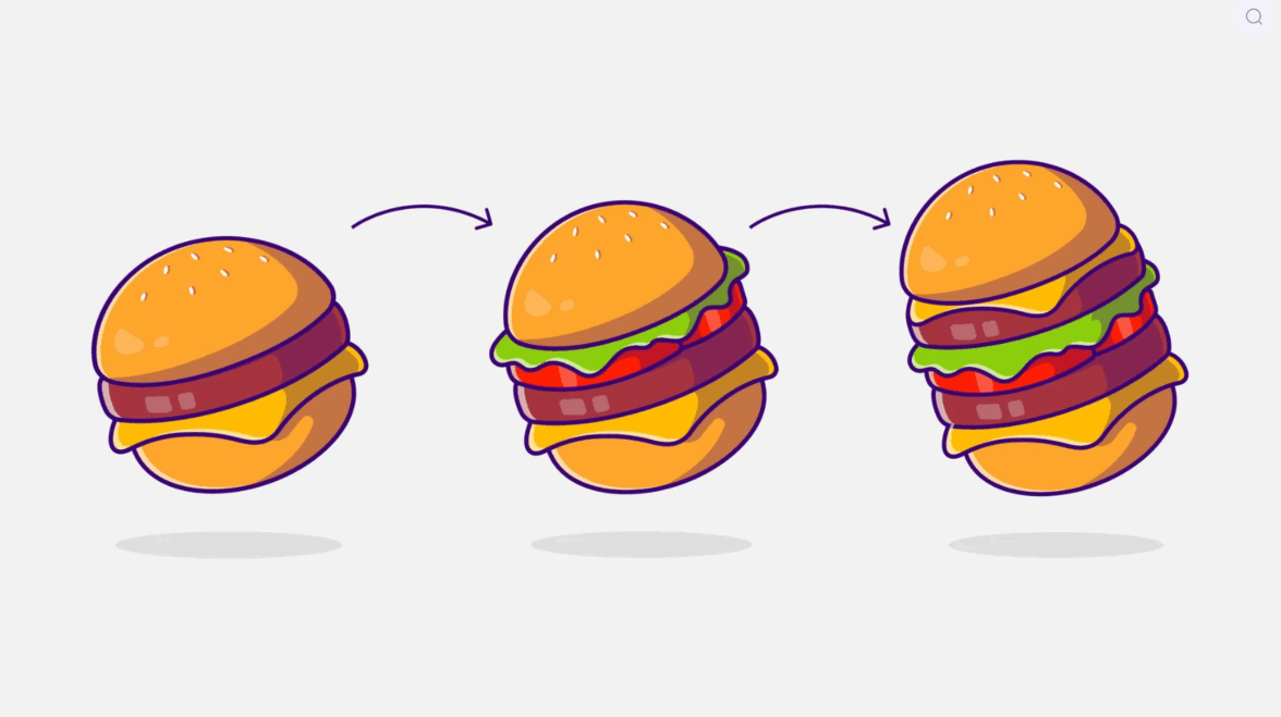 Например, MVP бургера — это котлета в булках. Представьте, что вы дали его покупателям, а они говорят: «сыра не хватает», «нужен помидор», «чем-то похрустеть бы!» После этого вы добавляете в бургер то, чего не хватало в первой версии.