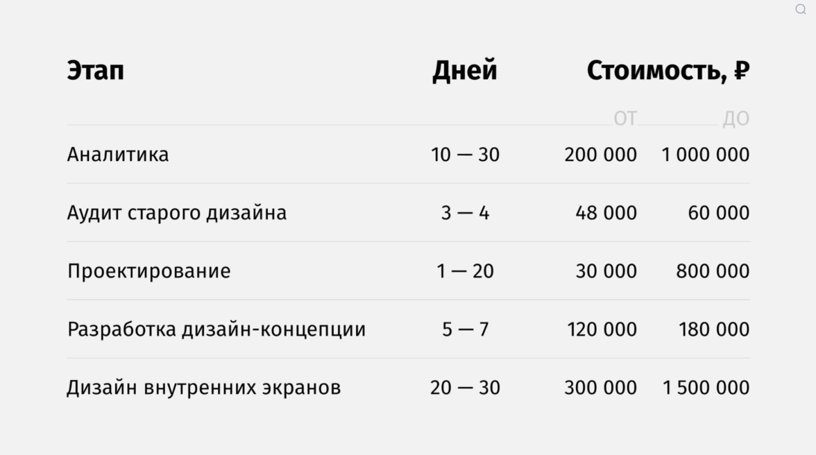 На дизайн этих экранов уходит примерно 100 часов, это около 2-х недель. По стоимости — от 300 000 ₽.