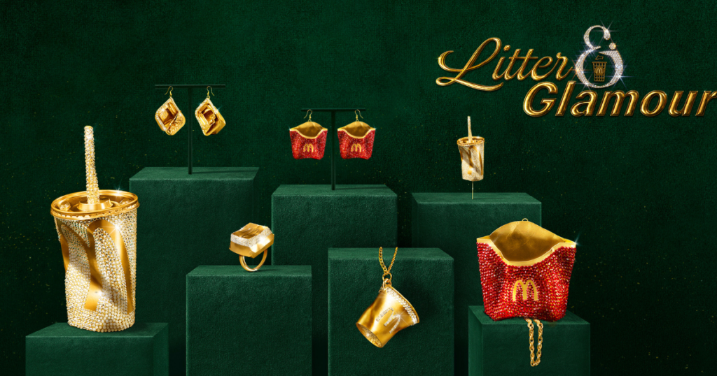 Новая кампания Litter & Glamour («Мусор и гламур») призвана привлечь внимание к проблемам вторичной переработки отходов. Для этого нидерландский McDonald’s совместно с семейной ювелирной мастерской De Vaal разработал эксклюзивную коллекцию украшений, выполненных из настоящего мусора, пишет Adweek.