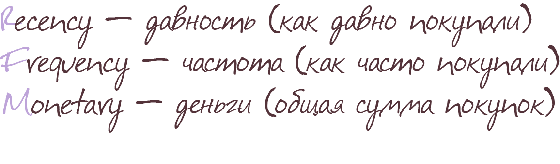 Этот анализ чаще всего используется на b2c-рынках. Он разделяет базу клиентов по трём важным покупательским характеристикам: давности покупки, частоте покупке и сумме чека.