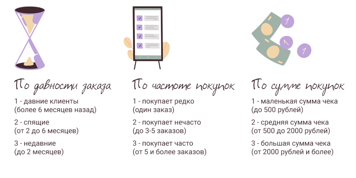 Показатели «когда покупал», «сколько обычно покупает» и «сколько обычно тратит» каждая компания определяет индивидуально в зависимости от специфики бизнеса и продукта. Например, частота покупок в продуктовом магазине и магазине кожгалантереи будет разная. Суммы чеков тоже будут различаться.