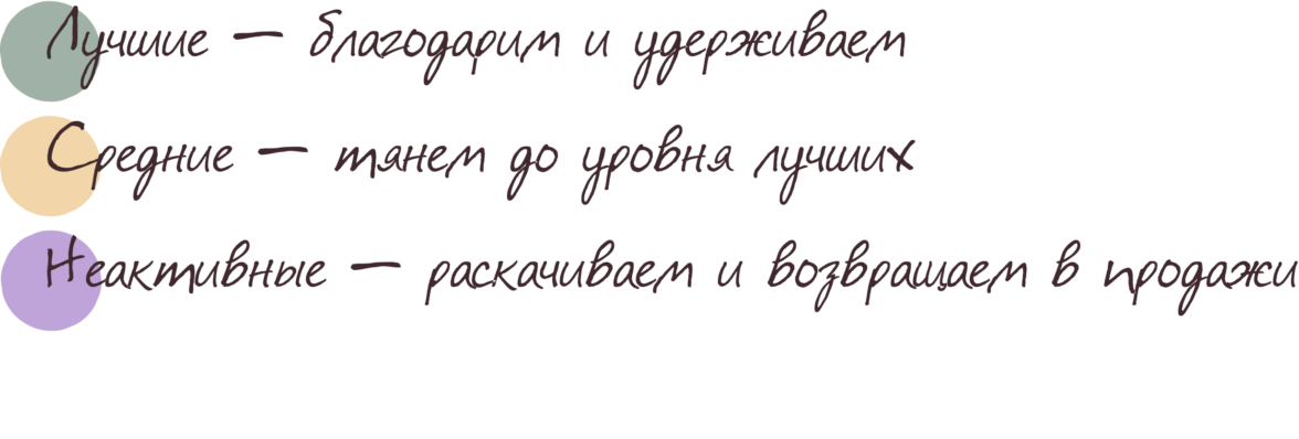 Итого: лучших благодарим и удерживаем на тех же продажах, средних тянем до уровня лучших, а неактивных пытаемся раскачать и вернуть в продажи.