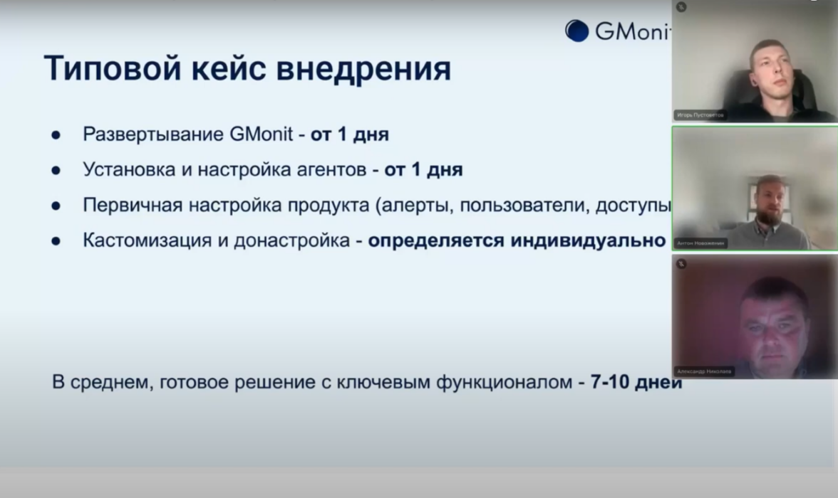 В дискуссии приняли участие: CEO GMonit Игорь Пустоветов, CTO GMonit Антон Новоженин и CEO К2 Консалт Александр Николаев.