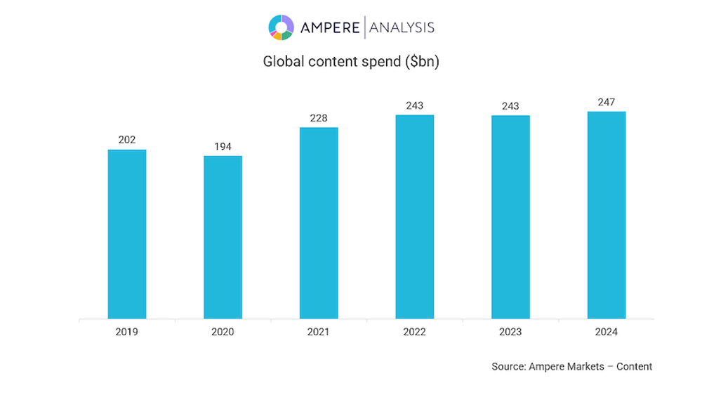 По прогнозу исследовательской компании Ampere Analysis мировые расходы на производство видеоконтента в 2024 году вырастут на 2% к показателям 2023-го и достигнут $247 млрд. В 2023 году инвестиции в создание фильмов и сериалов не показали роста к 2022 году и остались на уровне $243 млрд.
