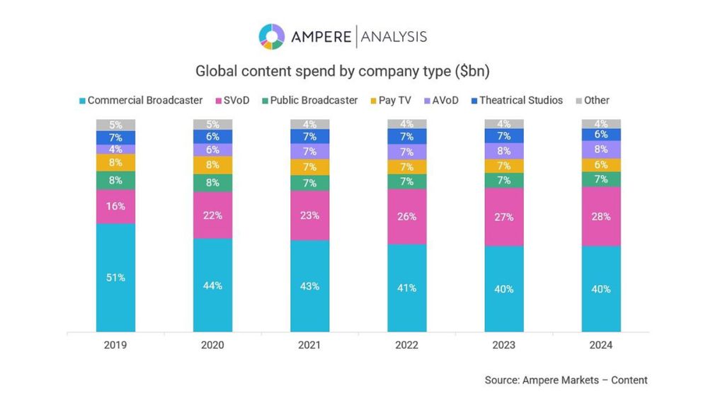 В мировом производстве контента продолжают доминировать коммерческие телеканалы, но их доля в общих расходах снижается: с 51% в 2019 году до 40% в 2024-м. Доля видеосервисов, напротив, растет — с 16% в 2019 году до 28% в 2024-м. Доли других сегментов — государственных вещателей, кабельного ТВ и кинотеатров — практически не меняются и остаются незначительными.