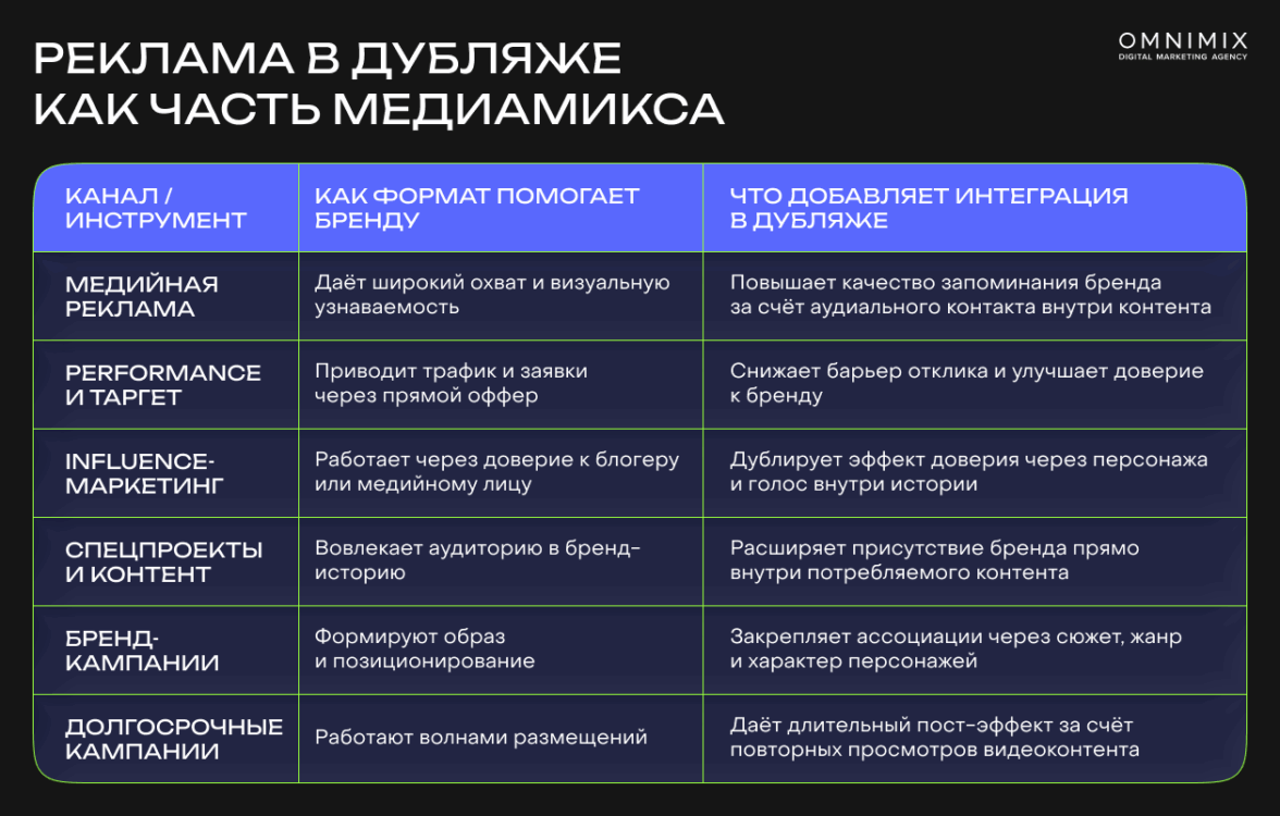 В результате интеграция в дубляже усиливает медиамикс за счет того, что формируется не разовый рекламный контакт, а узнаваемое присутствие в знакомом контенте — это напрямую влияет на доверие и отклик в других каналах.