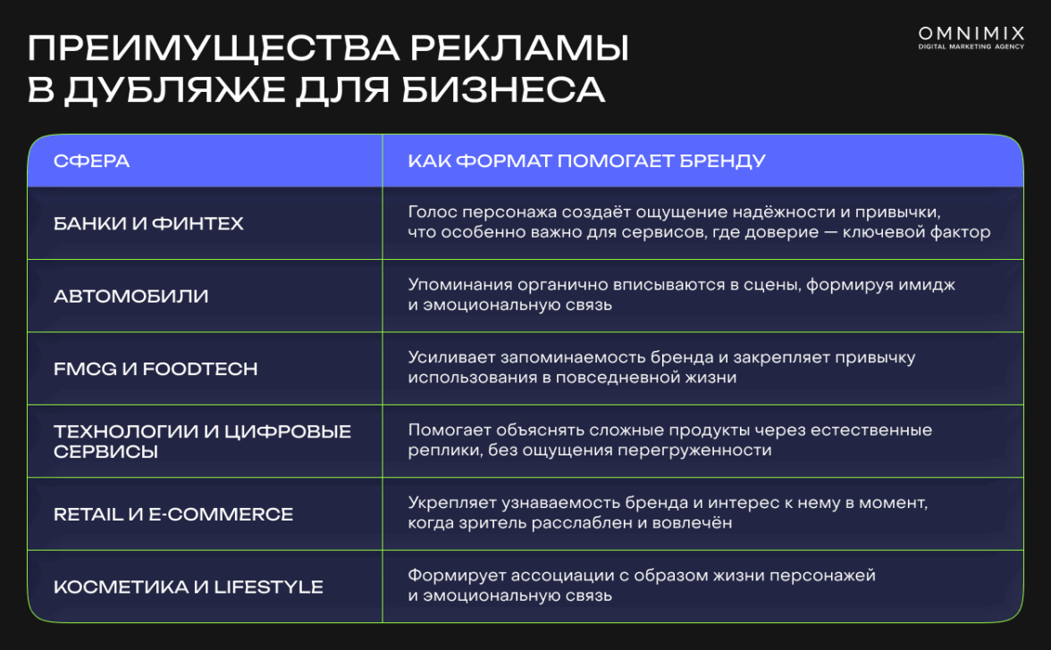 Нативные интеграции в дубляже особенно эффективны для брендов, которые хотят быть частью истории, которую смотрит аудитория. Формат работает там, где важны доверие, привычка и постепенное вовлечение.