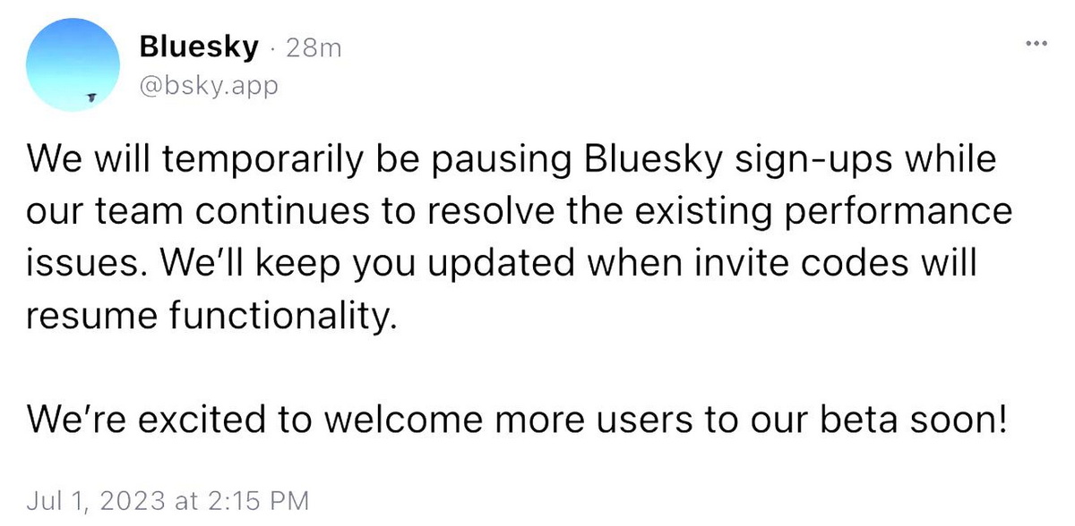 «Мы временно приостановим регистрацию Bluesky, пока наша команда продолжает решать существующие проблемы с производительностью. Мы будем держать вас в курсе, когда коды приглашения возобновят свою работу. Мы рады приветствовать больше пользователей в нашей бета-версии в ближайшее время!», — сообщила команда проекта в своем посте.